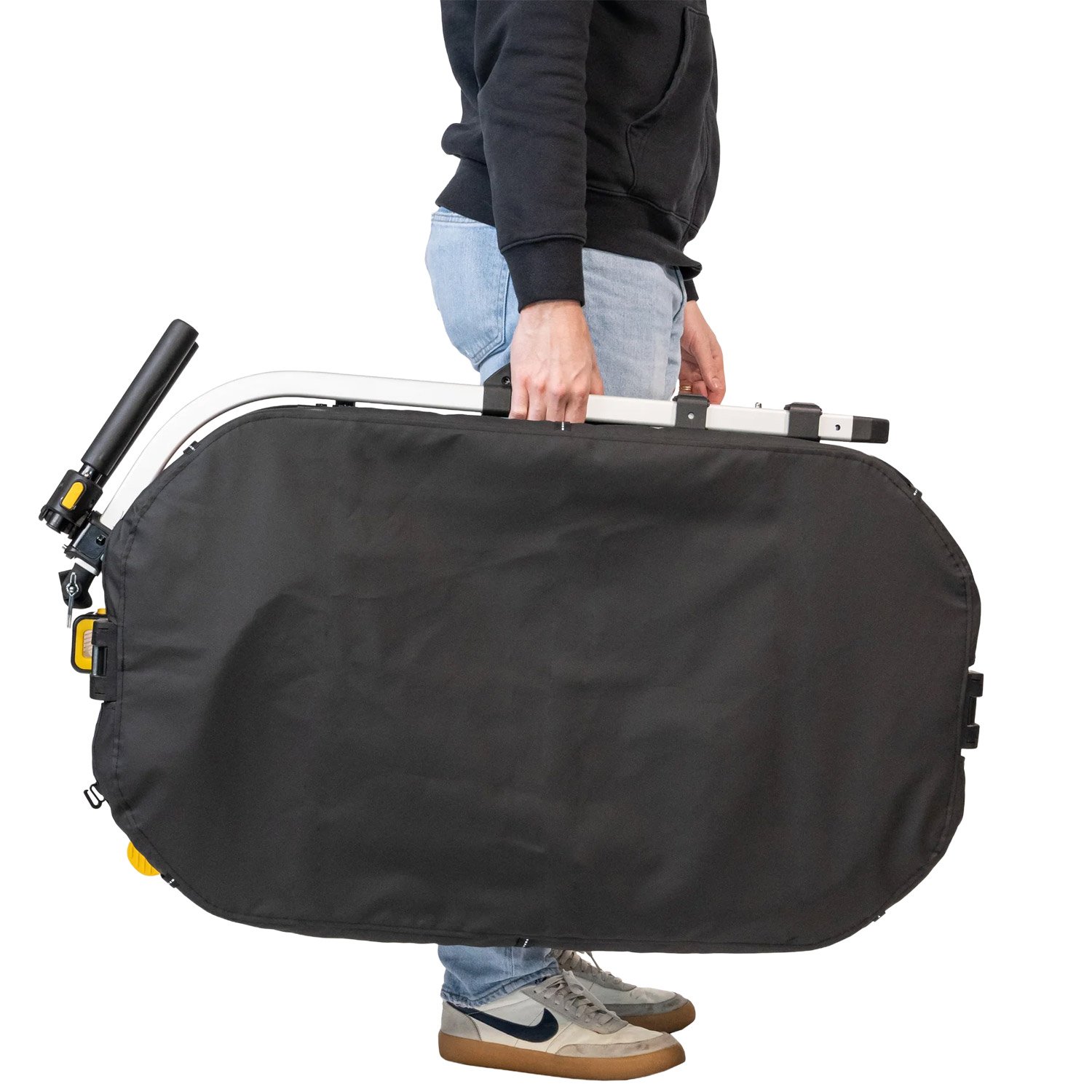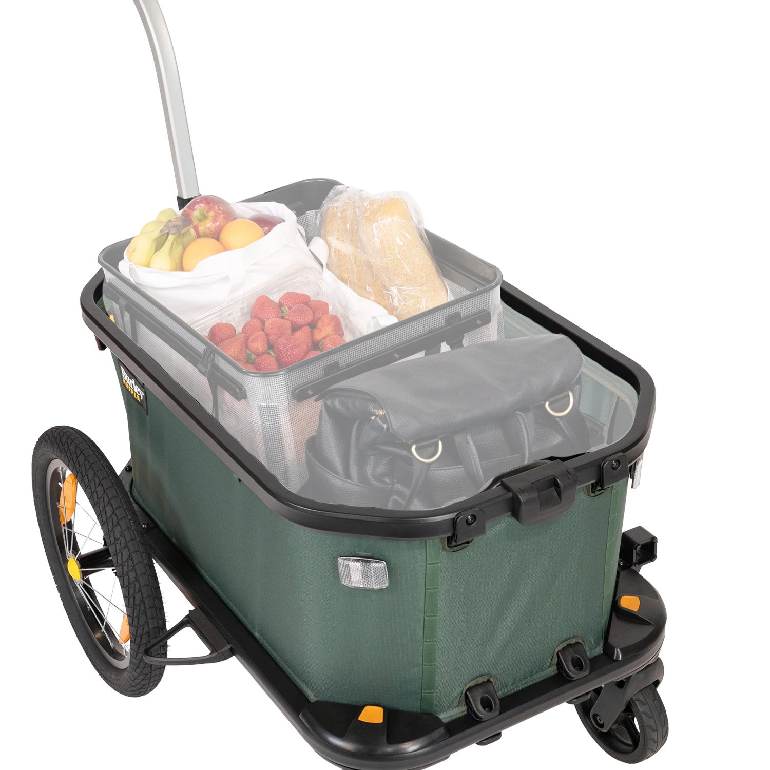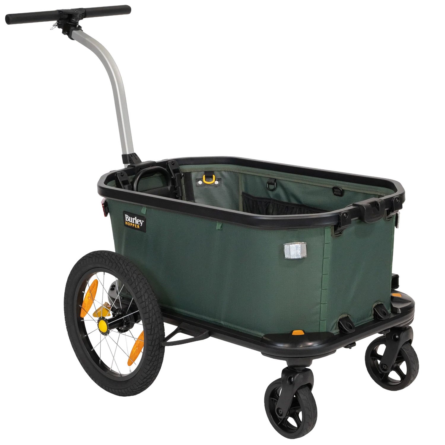 La conversione senza attrezzi da rimorchio per bicicletta a carretto a mano e viceversa consente di passare facilmente dalla bicicletta alla passeggiata. Il timone può essere rapidamente agganciato al manubrio del carretto e le ruote anteriori girevoli possono essere estese con la semplice pressione di un pulsante. L’Hopper consente di raggiungere in bicicletta eventi locali, luoghi di balneazione o negozi di alimentari, per poi passare rapidamente a una passeggiata a destinazione, trasportando bambini, attrezzi o generi alimentari